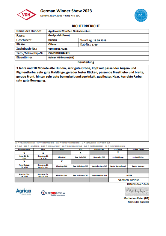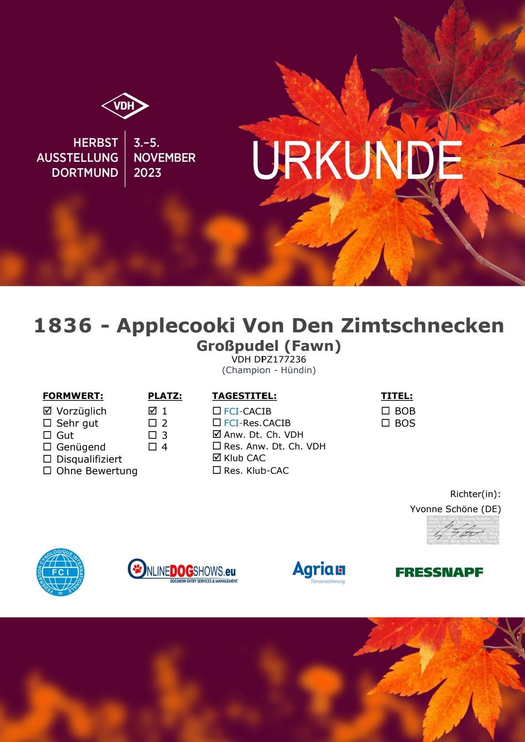 Applecooki hat von ihrem Papa ein sattes dunkles Rot mit einer schönen dunklen Pigmentierung mitbekommen und konnte auf mehreren Ausstellungen, wo sie voller Begeisterung für die viele Aufmerksamkeit selbstbewusst in die Runde trabte, die Richter und Richterinnen begeistern und einige tolle Bewertungen einheimsen. Im Jahr 2023 konnte sie sich den Champion Titel "German Winner" erlaufen und darf seitdem in der Champion Klasse starten.