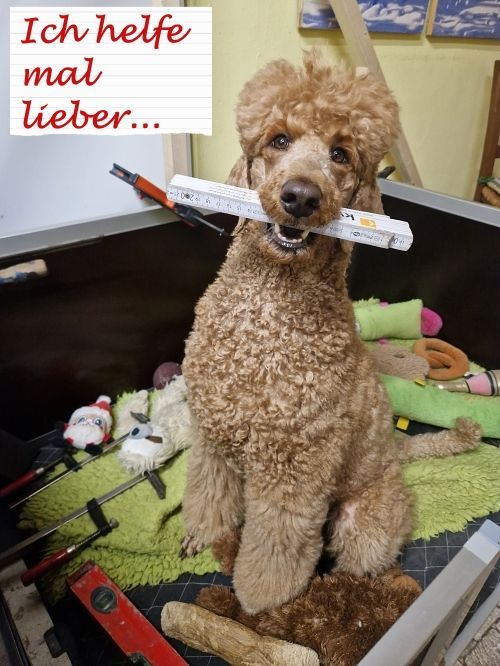 Ich habe den Eindruck Herrchen wird langsam ungeduldig. Mein Babybett ist mittlerweile ins Wohnzimmer umgezogen und er hat gefühlt zum 5. Mal noch einmal alle Schrauben kontrolliert. Muddi hat sich derweil an die Nähmaschine gesetzt und einen Himmel fürs Häuschen genäht. Oke, da lass ich mich dann ja doch mal zum Probesitzen überreden, ist ja schon ziemlich gemütlich. Meine Minipudelbande ist jetzt auf alle Fälle bereit für den Start außerhalb ihrer Tauchstation, jetzt wird nur noch an Gewicht zugelegt. Wenn ich mich allerdings so im Spiegel betrachte, möchte ich behaupten sie sind mopsig genug, ich bin es jedenfalls und trotzdem könnte ich den ganzen Tag vor mich hin futtern. Gestern hab ich mit Muddi und Juno ein Sonnenloch genutzt und einen kleinen Spaziergang gemacht. Juno kommt ja mit ihren fast 14 Jahren nicht mehr ganz so weit, aber pssst, unter uns, ich war selbst am schnaufen wie eine Dampflokomotive und froh als ich wieder in meinem Körbchen lag.... peinlich peinlich. Aber die sollen nicht glauben, dass ich schon ins Kinderzimmer ziehe. Geduld Geduld, ich werde es das Rudel wissen lassen, wenn ich soweit bin...Bis dahin heißt es schön weiter rumjammern und die extra Verwöhnkrauleinheiten und das extra leckere Fürdieachsoarmeschwangereessen genießen.