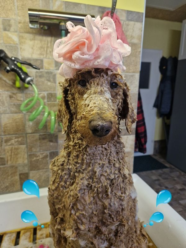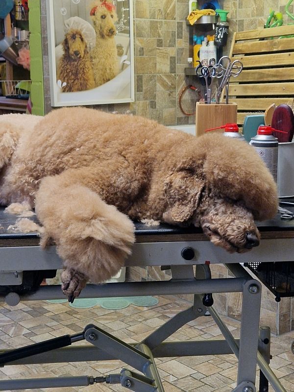 Meine lieben Leute, ich sage es euch, so eine Schwangerschaft ist kein Zuckerschlecken. Muddi meinte doch die Tage, ich müsste mal einen Termin beim hauseigenen Pudelstyler bekommen und eh ich mich versah, saß ich auch schon im feuchten Nass. Brrr, das braucht kein Mensch. Wie gut, dass die kleinen Löckchen in meinem Bauch eh auf Tauchstation sind und eine immer gleichbleibende Temperatur genießen können. Bei mir war es eher frisch und als ich endlich wieder trocken war, wurde es direkt Zeit für ein Nickerchen. Ich kann aber auch ganz klar sagen, schlafen und essen stehen bei mir im Moment ganz hoch in der Gunst, denn lange währt meine Ruhe nicht mehr. Die Kleinen sind jetzt schon fast perfekt, es fehlt nur noch ein wenig Speck auf den Rippen und dann sind sie bereit für einen aufregenden Start außerhalb ihres Tauchbeckens. Für mich war an dem Tag noch nicht Schluss, ich bekam noch eine dickebauchschwangerschaftsfreundliche Frisur verpasst. Und dass Kelly auch noch auf den Frisiertisch musste, war nur ein kurzer Trost, denn kaum war sie schick, hat Muddi schon wieder den Koffer gepackt und ist einfach mit ihr zu einem aufregenden Sportwochenende verschwunden.