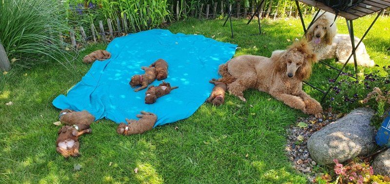 Nun sind wir schon zwei Wochen alt und Mama ist sehr zufrieden mit uns. Unsere Leidenschaft ist das Essen und Mamas Milchbar ist immer gut gefüllt. Längst haben wir uns verdoppelt und unser Fell zeigt schon die ersten Löckchen. Aber das Beste ist, wir können endlich die spannende Welt mit eigenen Augen sehen...wow.