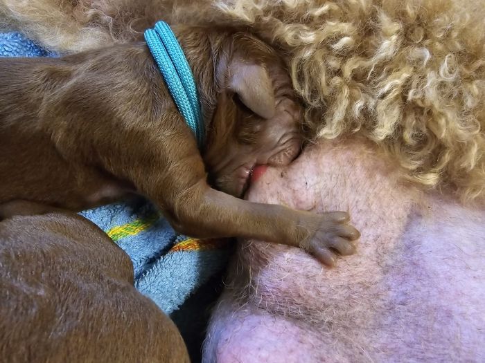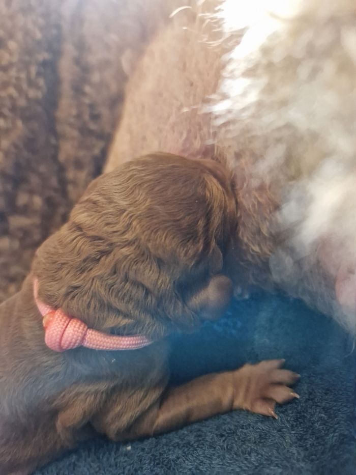 Völlig übermüdet schaffen wir es alle zurück auf's Sofa und kaum sind wir zu Atem gekommen, da kommt die lang ersehnte Presswehe! Voller Erleichterung sehen wir, dass tatsächlich die eine Wehe reicht, um endlich am Donnerstag um 9.05 Uhr dem ersten Welpen den Weg ins Leben zu zeigen. Fräulein Rosa mit stolzen 454 Gramm betritt munter und quierlig die Bühne des Lebens. Die Freude ist riesig und jetzt gilt es alle Kräfte zu bündeln, denn erst jetzt ist die eigentliche Geburt gestartet.