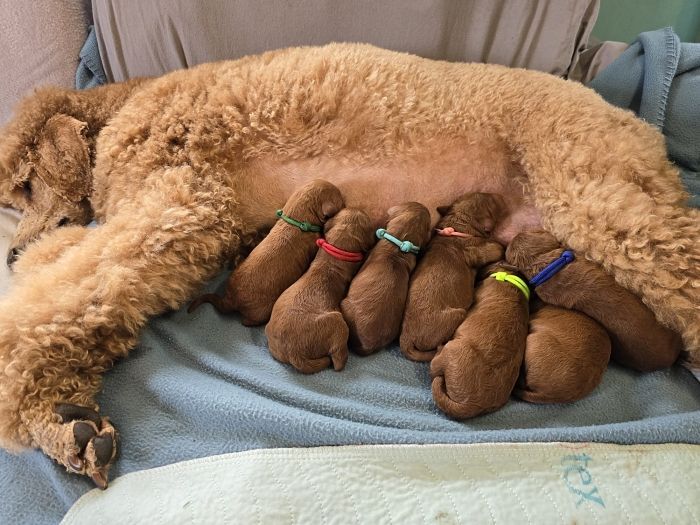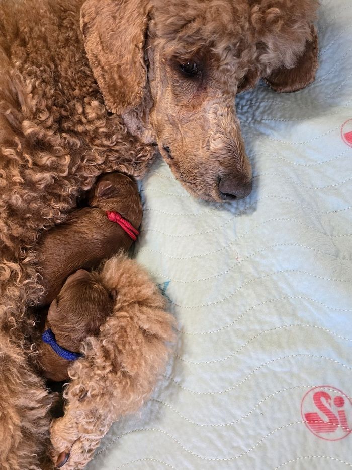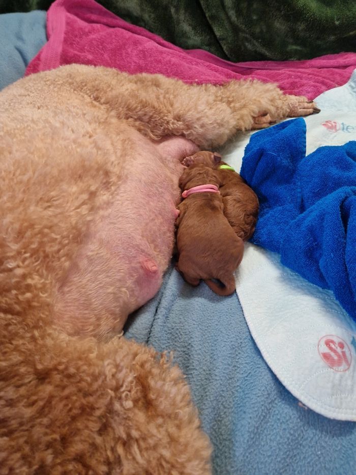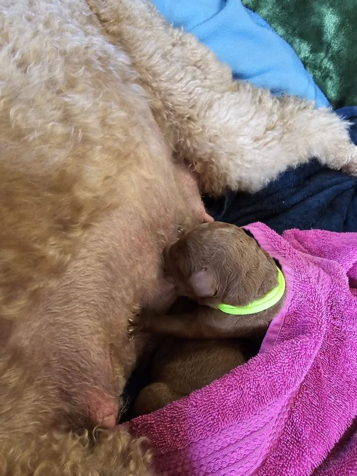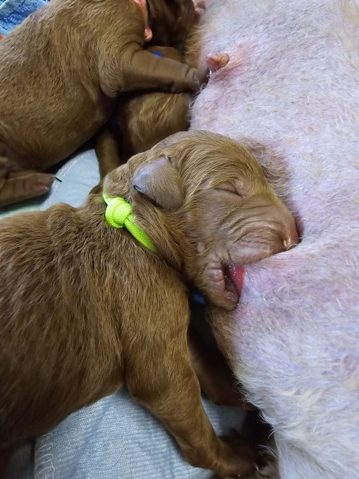 Um 10.45 Uhr kommt Herr Hellgrün mit 424 Gramm auf die Welt, um 12 Uhr Herr Blau mit 345 Gramm und um 12.45 Uhr Herr Türkis. Es scheint so, als wenn jetzt alles reibungslos läuft. Cooki verdient meinen ganzen Respekt. Während wir alle total erschöpft sind, arbeitet sie souverän Welpe für Welpe ab. Was für eine Übermama. Jedes Baby wird liebevoll begrüßt, trockengeleckt und sanft an die Milchbar geschubst und einsortiert. Zwischendurch gönnt sie sich immer mal wieder ein kurzes Schläfchen auf der Seite, doch kaum kommt die nächste Presswehe ist sie kraftvoll und hellwach dabei, einfach Wahnsinn. So gut es geht, versuchen wir sie zu unterstützen, nabeln ab, reiben mit trocken, wiegen und dokumentieren. Bei mir erreicht der Kaffee schwindelerregende Mengen und ich bin froh, dass wir zwischendurch jedenfalls die Zeit finden, den ein oder anderen Happen zu essen. Weiter geht es um 13.15 Uhr mit Herrn Dunkelgrün mit 379 Gramm und um 13.50 Uhr Herrn Rot mit 421 Gramm. Wir haben jetzt ein Mädchen und 5 Jungs, das ist eigentlich eine inakzeptable Quote, doch Cooki hat da eigene Vorstellungen, denn um 14.25 Uhr kommt der nächste Junge, Herr Gelb mit 417 Gramm. Wir wollen noch ein Mädchen !! 15.15 Uhr "Herr!" Silber mit 378 Gramm.
