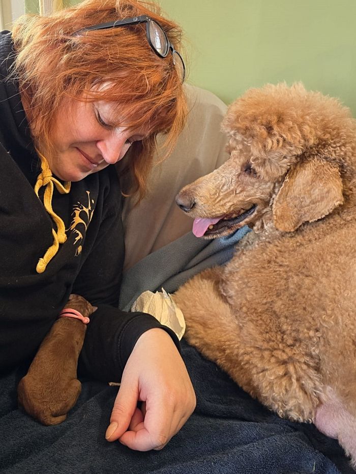Um 3 Uhr entscheide ich mich für eine Ampulle Calcium um damit die Wehentätigkeit anzuregen. Um 4 Uhr immer noch keine Presswehen. Nach wie vor ist Cookis Zustand nicht besorgniserregend, sie ist einfach nur erschöpft. So geben wir der Natur bis zum frühen Morgen noch eine Chance, aber um 8 Uhr entscheide ich mich dann, Cooki ins Auto zu packen und sie meiner Tierärztin vorzustellen. Dort wird meine Einschätzung nach einem Ultraschall bestätigt, der Mama und den Kindern geht es gut, doch der erste Welpe ist spürbar, ihm fehlt nur eine Presswehe. Also noch mal Calcium, diesmal gespritzt und hochdosiert und dann schnell zurück nach Hause, keiner möchte eine Autogeburt.