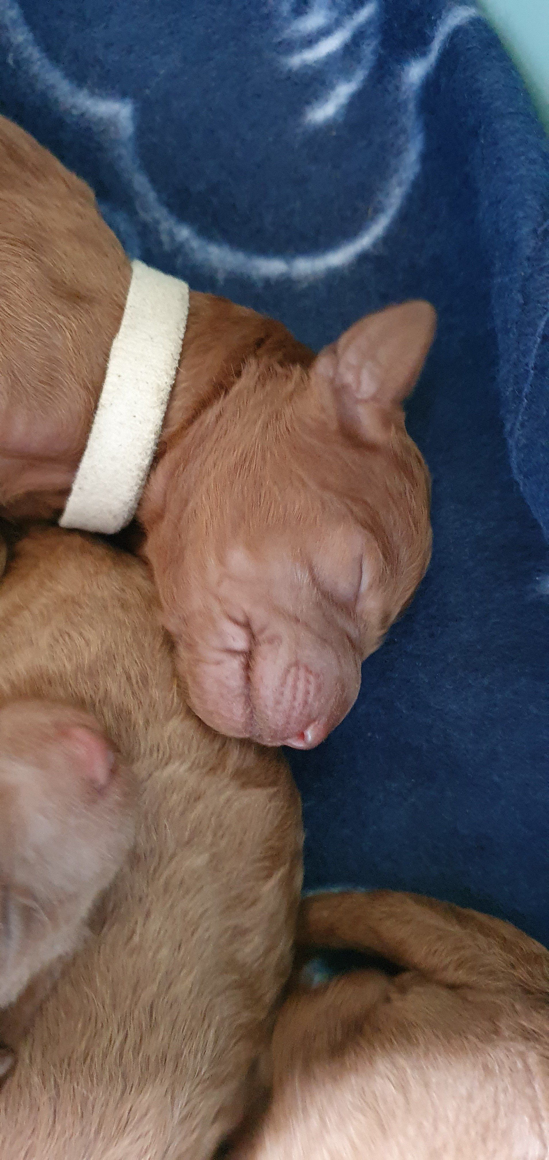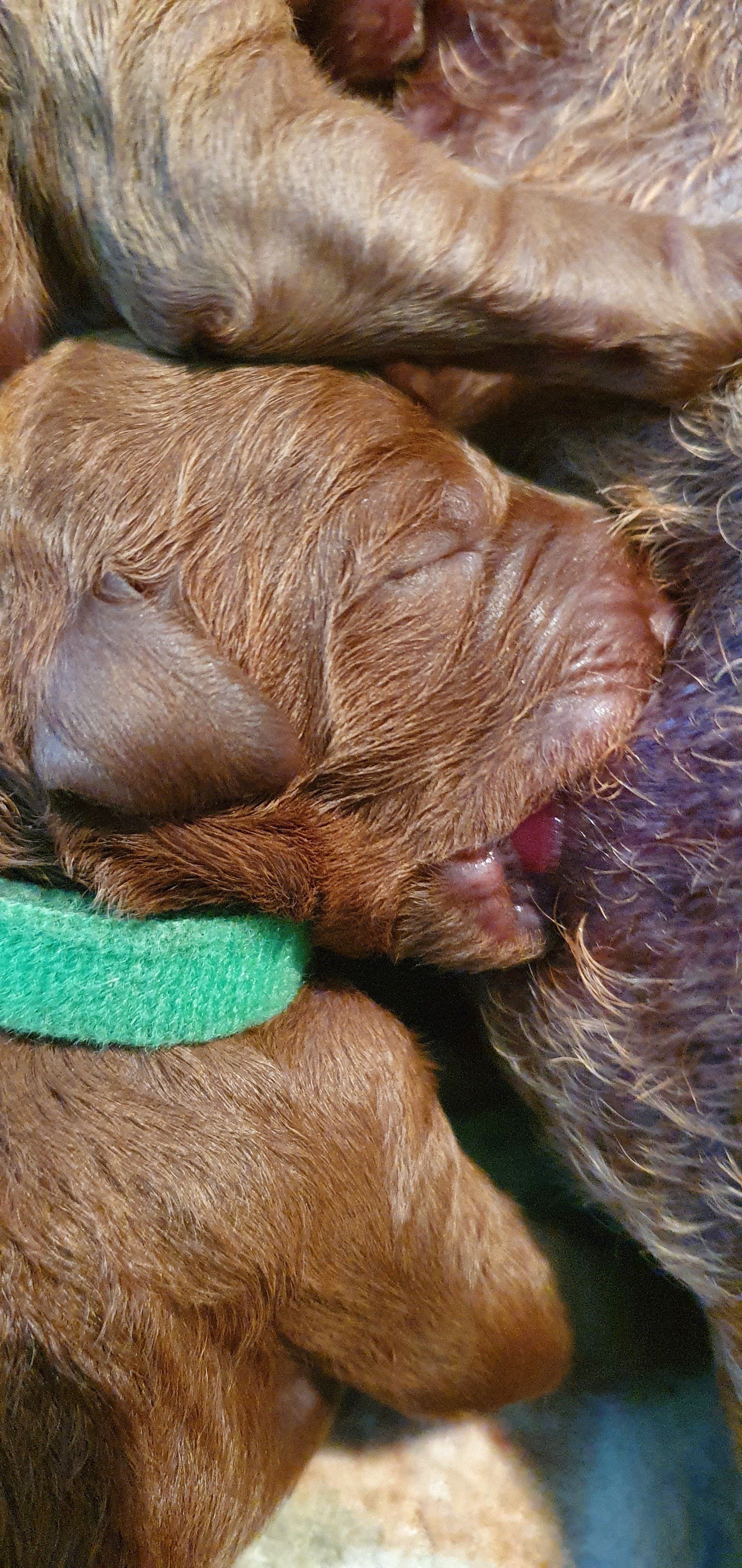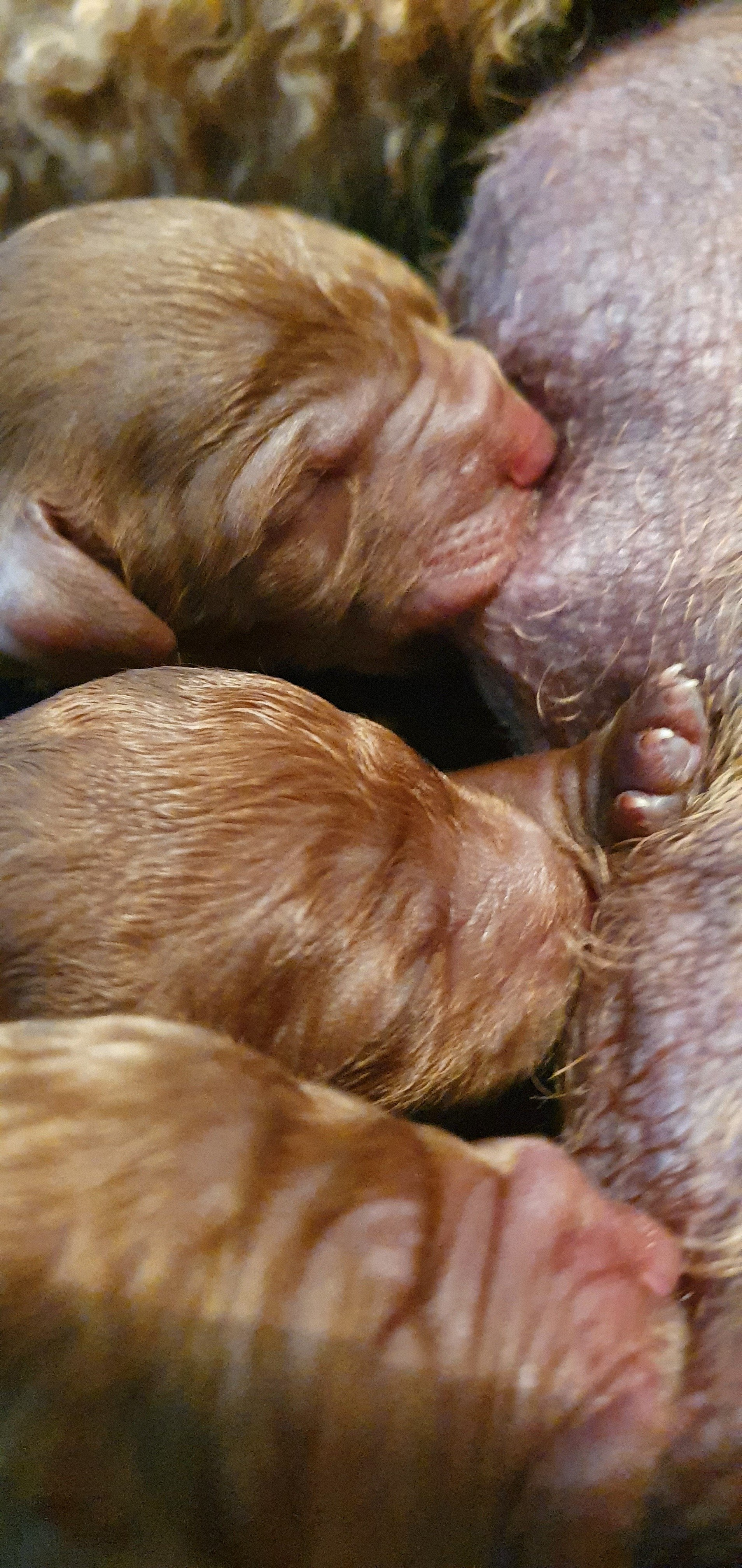 Eine ereignisreiche Geburt ist zu Ende, Cooki entspannt sich und fällt bald in einen tiefen Schlaf und ihre acht properen Babys kuscheln zufrieden in Mamas Locken.