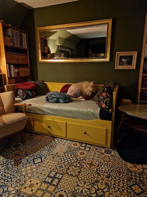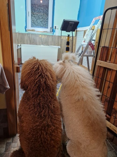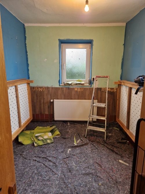 Puh, jetzt ist schon wieder eine Woche rum und vor lauter Stress bin ich gar nicht zum Schreiben gekommen. Den ganzen Tag wird hier gehämmert und gemalt und ich habe die Oberaufsicht. Hinzu kommt noch die ganze Schwangerschaftsgymnastik und Muddi will auch noch betreut werden. Ihr lacht, aber ich habe richtig Arbeit gehabt. Bei Herrchen mussten wir aufpassen, dass er unser Zimmer so renoviert, wie wir das wollten und nicht er! Er wollte eine praktische Raufaser, ich wollte Wolken und Gugelhüpfchen wollte Einhörner ... nun ratet mal, wer gewonnen hat? Tja, meinem Schwangerschaftstreueleidensblick kann niemand widerstehen und schließlich bin ich Muddis Sturmwölkchen, da kommen nur Wolken infrage! Ich muss aber sagen, es ist sooo schön geworden. Ich werde es aber erst mal nicht mehr lange genießen können, denn ich ziehe bald um. Herrchen hat die nächste Baustelle eröffnet, er macht den Kreißsaal und die Wöchnerinnenstation schick und hat mir versprochen, dass ich die nächsten Tage umziehen darf.