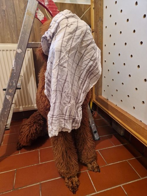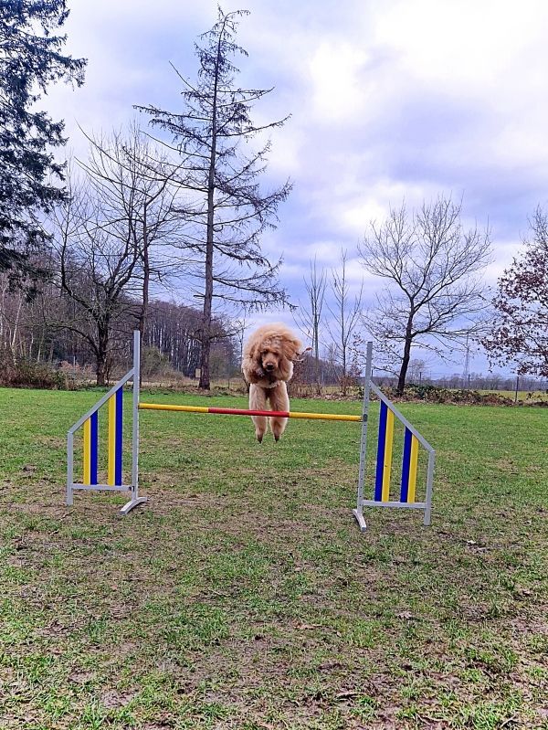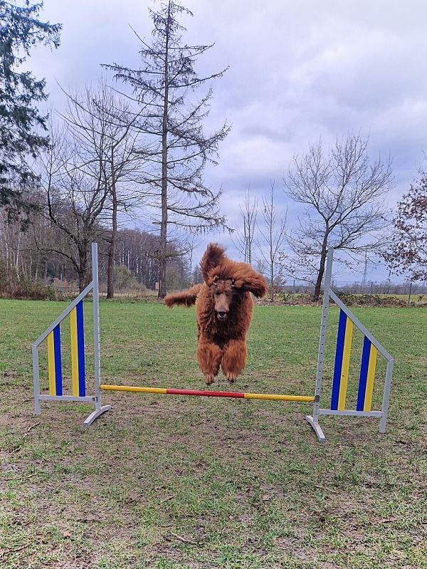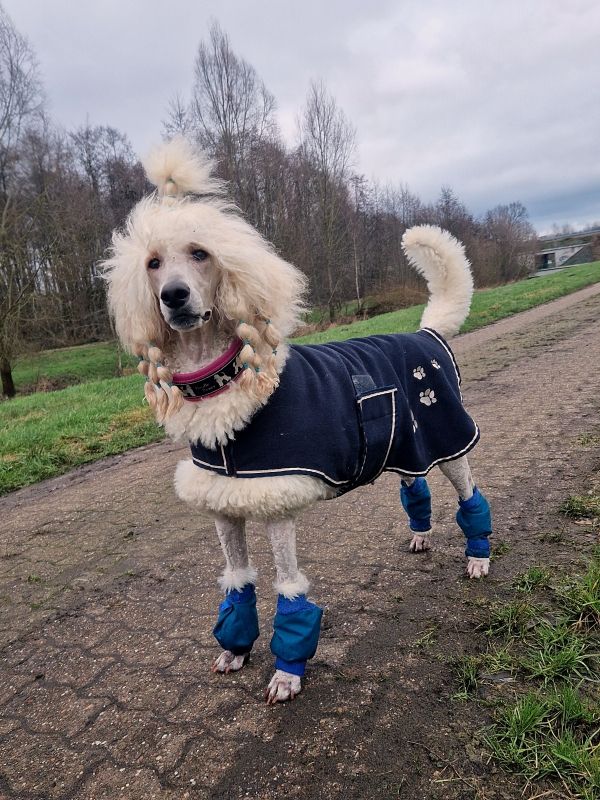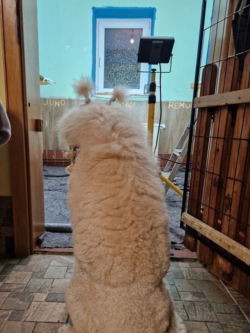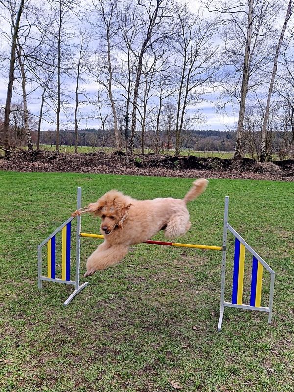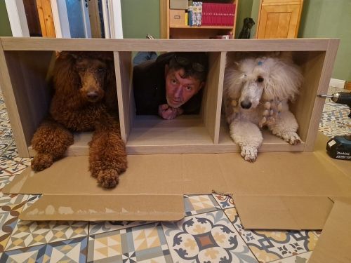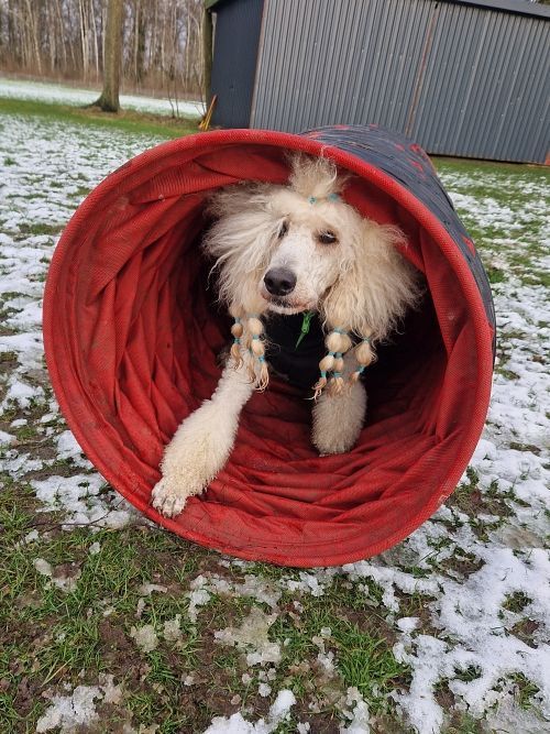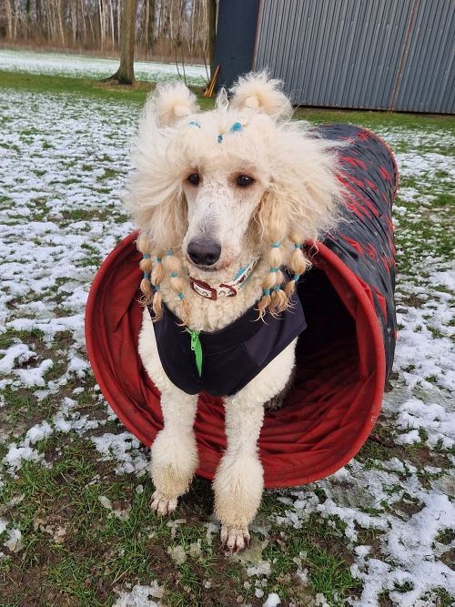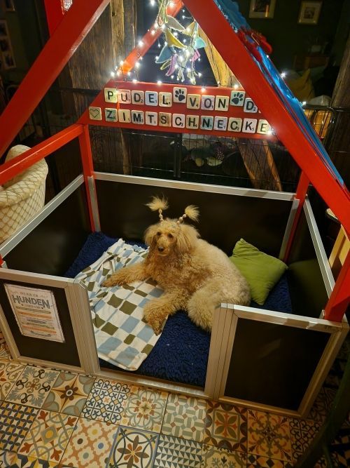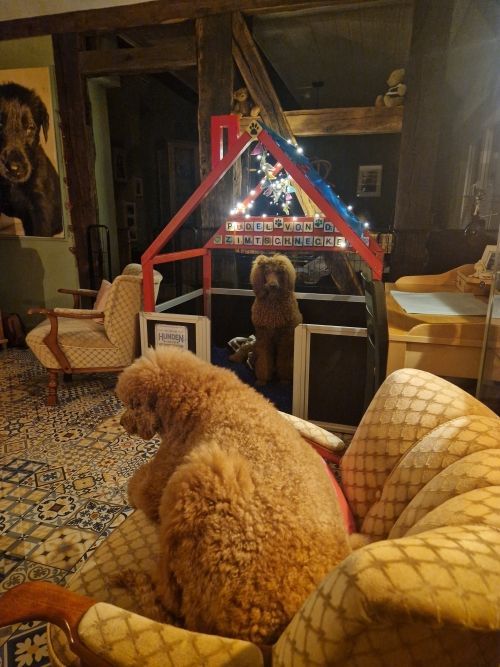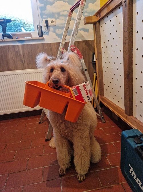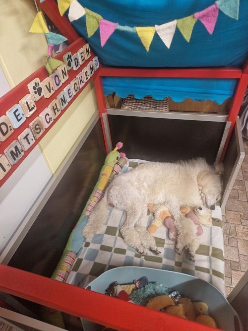 Ein bisschen hatte sie ja auch gut bei mir, denn sie hat mir einen wunderschönen, gemütlichen Kreißsaal mit angeschlossener Babystation eingerichtet. Das Babybett kenne ich ja schon, schließlich bin auch ich dort auf die Welt gekommen. Ich kann mich allerdings gar nicht mehr daran erinnern, dass es eine Fußbodenheizung hat, sooo gemütlich. Das einzige Problem ist im Moment noch, es ist immer besetzt, und zwar nicht von mir... Ein paar Tage gebe ich euch noch und dann bekommt ihr alle die Kündigung, große Pudel und Minihonigkuchenpudel. Meine kleinen Honigbärchen sind nämlich jetzt schon fertig für die große Welt, jetzt heißt es nur noch, etwas dicker zu werden, und dann raus aus eurem feuchten Heim, das Gestrampel ist nicht mehr lange zu ertragen. Ach, die Zeit zieht sich wie ein zäher Kauknochen. Ich bin so gespannt. Haben sie wohl meine Nase? Und die Pfötchen, von mir oder ihrem Papa? Und werden sie Agility auch so lieben wie ich? Und was ist mit ihren Ohren? Ich finde meine besonders gelungen, die ihres Papas hängen halt so rum. So viele Fragen, bald gibt es Antworten! Bleibt munter, ich gehe schlafen, die Wurfbox ist gerade frei...💤