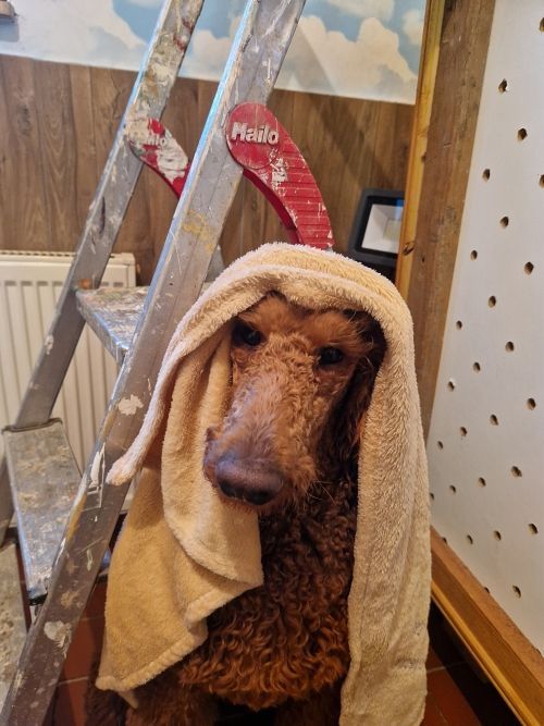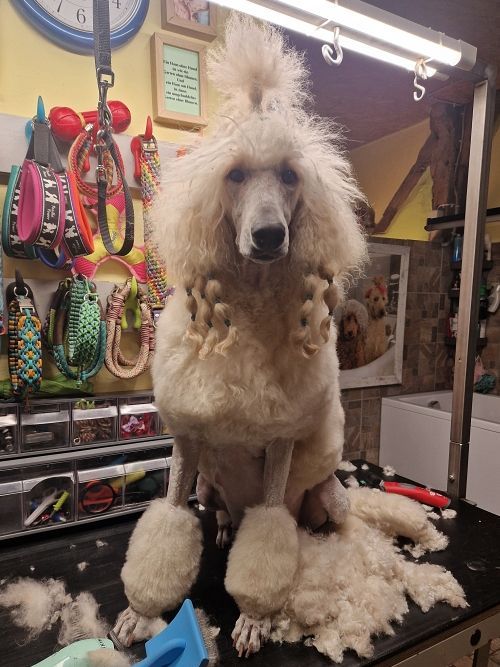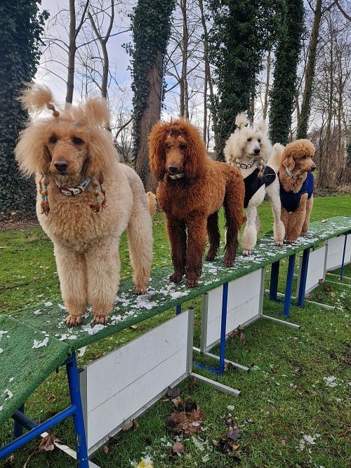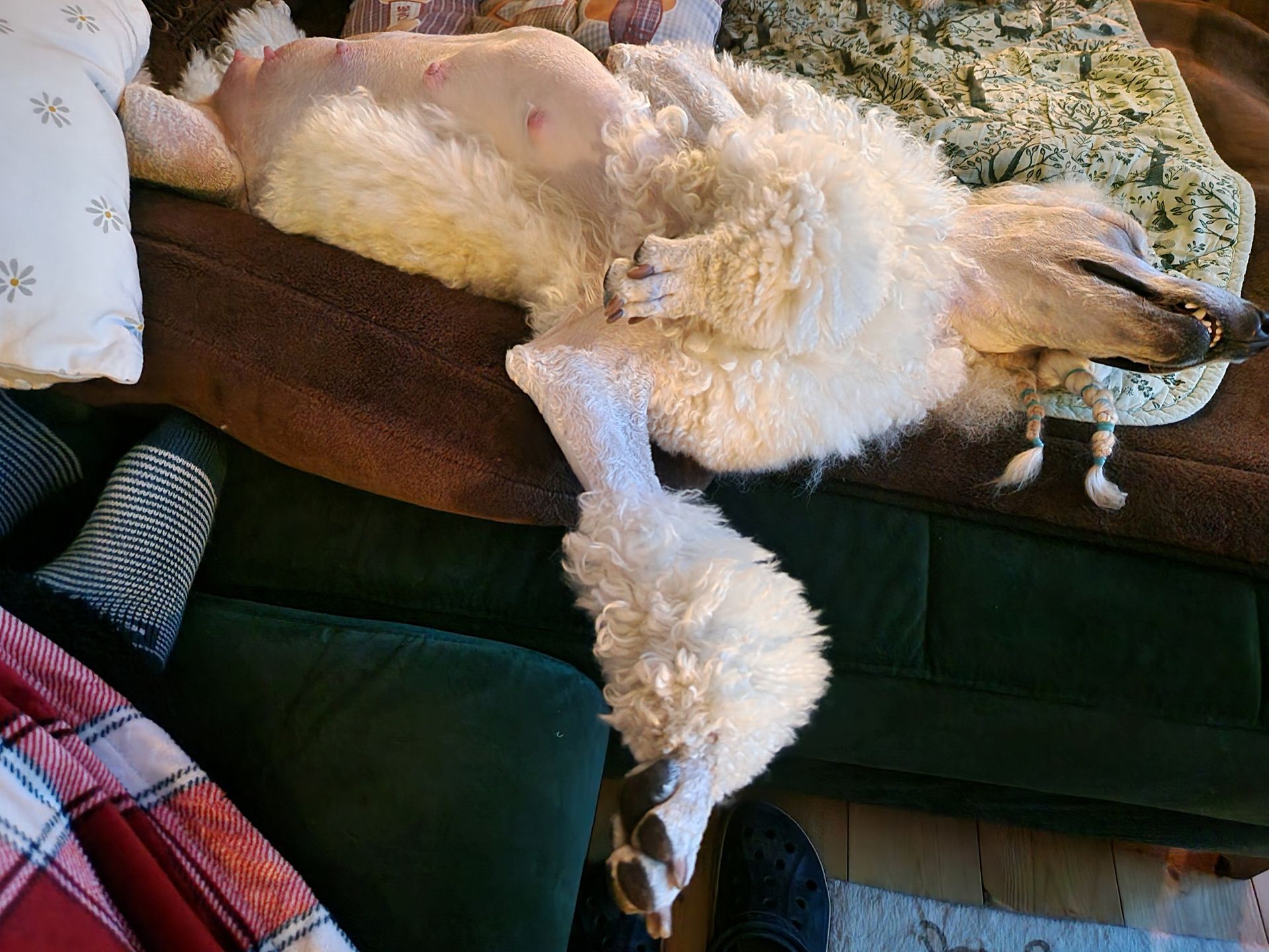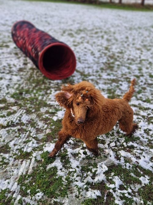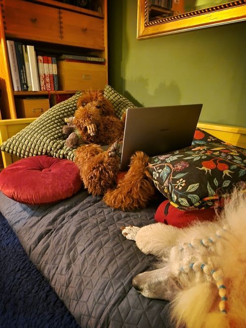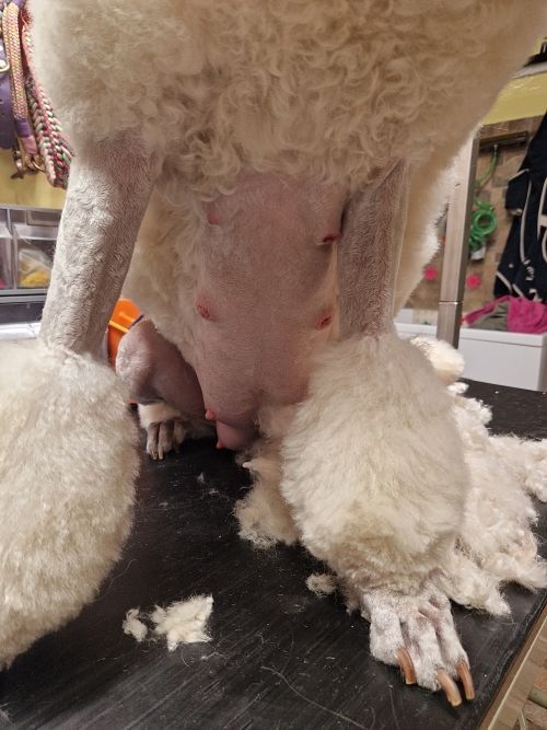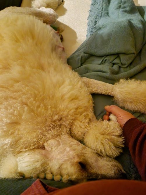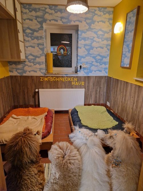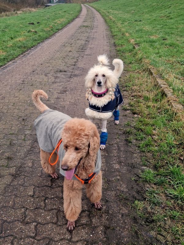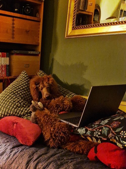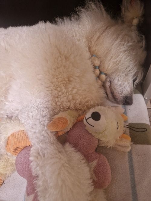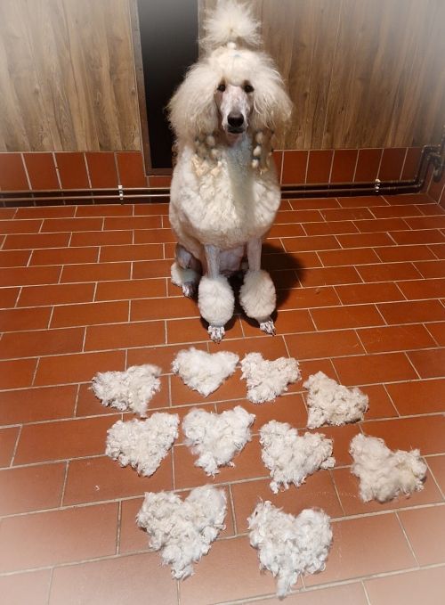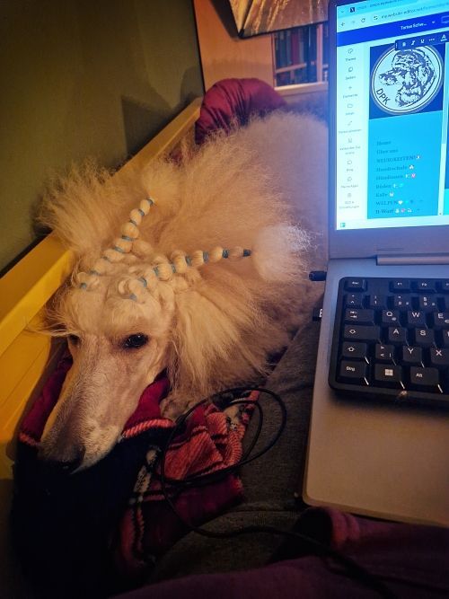 Besonders anstrengend ist Muddi im Moment, sie braucht besonders Betreuung. Den ganzen Tag läuft sie hinter mir her und schaut mich immer so komisch an. Zum Glück schmeckt mir das Essen wieder, wie ihr an meinem aktuellen Gewicht sehen könnt. Immer will sie kuscheln und an meinem Bauch horchen. Was will sie da hören? Ich meine, meine kleinen, mittlerweile dicken Honigküchlein bellen ja schließlich noch nicht. Es sind jetzt schon richtige kleine Pudel mit allem, was dazu gehört. Jetzt müssen sie nur noch wachsen und ein paar Locken fehlen auch noch. So langsam bin ich richtig stolz, dass ich die nächste Generation Zimtschnecken auf die Welt bringen darf. So, jetzt werde ich aber doch ganz schön müde und Muddi will einfach nicht still liegen, wie soll man da in Ruhe auf ihr schlafen können, ich sag's ja, sie braucht viel Betreuung.