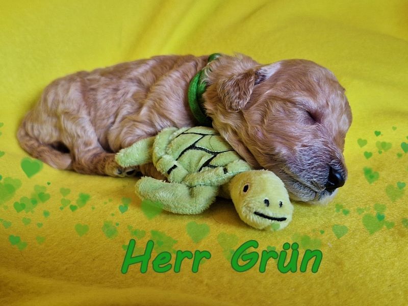 Alle 10 entwickeln sich prächtig. Das Fell zeigt erste Löckchen und die winzigen Näschen und Pfötchen glänzen schwarz wie Ebenholz. Ein erstes zaghaftes Blinzeln der kleinen Knopfaugen ist auch schon zu sehen und wenn Mama die Bühne betritt, dann wird geknurrt, gefiept, gebellt und chaotisch durch die Gegend getorkelt, immer auf der Suche nach der goldenen Milchquelle. Ich bin mir sicher, bald ist es mit der Ruhe im Kinderzimmer vorbei, das Minizimtschneckenrudel wird langsam mobil...